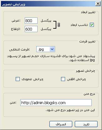- تغییر فرمت: برای تغییر فرمت تصویر خود به فرمت های دیگر تصویر (gif , .jpg, .bmp, .png.) شما می توانید از این قسمت استفاده کنید. همانگونه که در پایین این بخش توضیح داده شده است، پیشنهاد می شود برای فشرده سازی حجم تصویر از فرمت jpg. استفاده کنید.