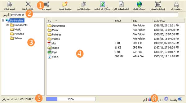 - در این بخش شما دسترسی سریع و آسانی به پوشه های خود به صورت درختی خواهید داشت. که با کلیک کردن بر روی هر پوشه، محتویات آن را در قسمت سمت راست پنل(بخش 4) خواهید دید.