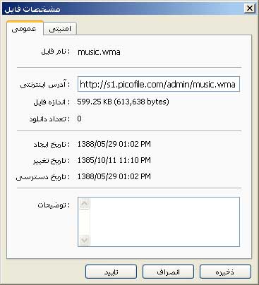 - مشخصات فایل: با انتخاب فایلی و زدن این دکمه پنجره ای باز می شود که شامل دو سربرگ (tab) می باشد. سربرگ عمومی شامل قسمت های مختلف است از جمله: نام فایل، آدرس فایل در سرور که در واقع با ارایه این آدرس به دیگران می توانند فایل مورد نظر را دریافت(download) کنند، تعداد دانلود، تاریخ ایجاد فایل در سیستم، تاریخ تغییر، تاریخ آخرین دسترسی به فایل.