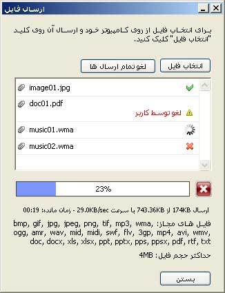 اگر بخواهید فقط فایلی که در حال ارسال می باشد را لغو کنید کافی است بر روی کلید قرمز رنگی که در آن ضربدر سفید خورده و در جلوی مستطیلی که مقدار فایل ارسالی را نمایش می دهد، می باشد کلیک کنید تا با تایید سوالی مبنی بر انصراف از ارسال، جلوی ارسال فایل را بگیرید. همچنین اگر بخواهید فایل هایی که در صف قرار دارند را از صف حذف کنید می بایست بر روی علامت ضربدر قرمزی که جلوی اسم فایل در صف می باشد کلیک کنید.